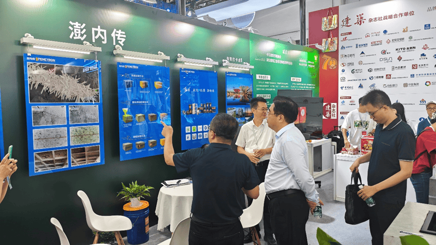 北京澎內(nèi)傳公司展出了全球領先的混凝土滲透結(jié)晶自愈合技術以及系統(tǒng)產(chǎn)品,展板上生動形象的展現(xiàn)出滲透結(jié)晶的技術原理、電鏡下的結(jié)晶形貌和實效工程照片等;實物水池模型與試塊直觀地看到結(jié)晶自愈合后的功效。澎內(nèi)傳先進的滲透結(jié)晶科技不僅能從根本上解決混凝土結(jié)構(gòu)的滲漏水頑疾,還能提高混凝土整體的耐久性,延長結(jié)構(gòu)的使用壽命60年。產(chǎn)品低碳環(huán)保,為我國造就高質(zhì)量建筑和可持續(xù)發(fā)展的目標提供堅實的技術基礎和科學的安全保障,更好的滿足人們對好房子的需求。