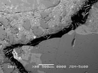 一旦反應被激活可以沿著混 凝土的裂縫看到粗糙長晶體 和細小針狀晶體的生成。晶 體完全封堵住裂縫,降低混 凝土滲透性,提供防水保護 | BEI拍攝的與上圖相同 裂縫表明澎內傳系統 生成晶體正在密封該裂縫 | 放大的圖片清楚地顯示 裂縫中的粗糙長晶體 和細小針狀晶體 | 放大10,000倍后可以看到 這些晶體是怎么形成的 |